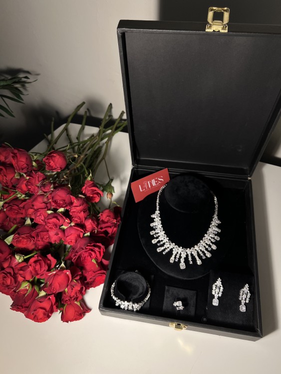 طقم راقيزيراكون ضمان على اللونمناسب للمناسبات العرايس5 قطععقد و اسورة و 2 اقراط و خاتمبوكس جلد عليه كتابه حسب طلبكم